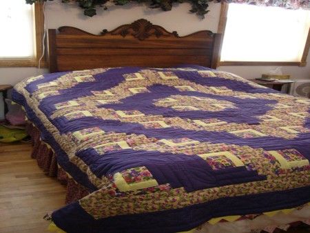 Log Cabin - One of the oldest patterns around. It has been found on mummys and in mosiac tile floors of buildings. It is speculated that the first time the design was used to make bed covers was in England in the early 1800s. But it was the American quiltmaker who developed it and made it famous. It became a staple in the life of the early pioneers, the pattern lending itself to using the snippets of fabric that were too small to use any where else. How wonderful that these pioneer women in their austere life could use what ever they had wool, velvet, calico, perhaps even worn out sheets, to artistically make their craft.